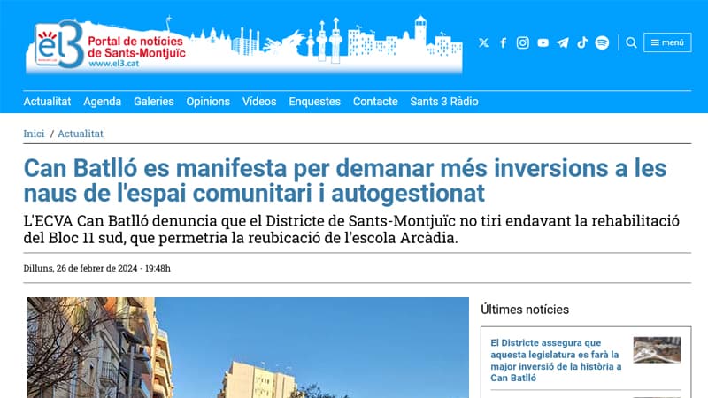 El passat divendres a la tarda, l’Associació Can Batlló es va manifestar al carrer Constitució, del barri de La Bordeta, per demanar més inversions a aquest espai comunitari i autogestionat. Des de l’ECVA Can Batlló denuncien que el Districte de Sants – Montjuïc no tiri endavant la rehabilitació del Bloc 11 sud, que permetria la reubicació de l’escola Arcàdia.